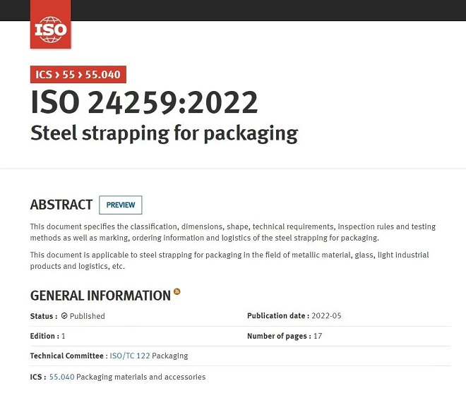2022年5月23日,由中国牵头研制的ISO 24259:2022 Steel strapping for packaging《包装用钢带》国际标准正式批准发布。该标准作为我国包装领域第一个ISO国际标准,填补了我国在该领域的空白,标志着我国在包装领域的国际标准化工作取得重大突破。