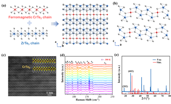 基于“结构功能区”的设计思想,中国科学院上海硅酸盐研究所先进材料与新能源应用研究团队与北京大学、复旦大学合作,设计出新型的二维层状反铁磁材料CrZr4Te14。单层CrZr4Te14由一维的[CrTe2]磁性原子链和[ZrTe3]原子链按照1:4共点连接而成,每一层通过范德瓦尔斯键堆叠而成。研究在扫描透射电子显微镜下可以观察到一维的[CrTe2]原子链被[ZrTe3]链所隔开。此外,科研人员通过变温拉曼光谱探究了CrZr4Te14在低温下原子振动模式的演变,通过拟合可知拉曼峰的温度依赖系数高于二硫化钼这些典型的层状材料,这是该结构中每一层上的褶皱结构导致的。
