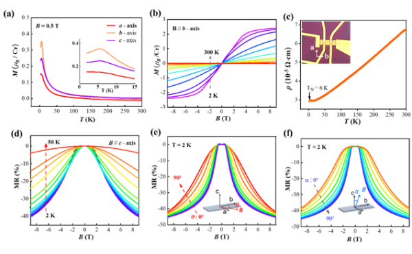科研团队研究了CrZr4Te14磁性起源和不同方向磁场下的电学输运特性。CrZr4Te14在6K下发生反铁磁转变,计算表明磁性来自具有高自旋电子态的铬离子。在强磁场下,少层的CrZr4Te14电子器件表现出巨负磁阻效应。由于CrZr4Te14准一维结构特点,在不同方向的磁场下负磁阻行为具有明显的各向异性。