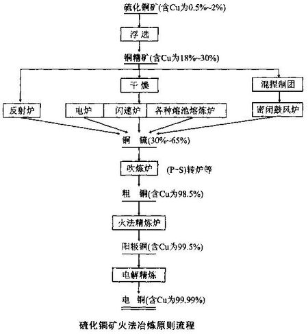 通过熔融冶炼和电解精火炼生产出阴极铜,也即电解铜,一般适于高品位的硫化铜矿。火法冶炼一般是先将含铜百分之几或千分之几的原矿石,通过选矿提高到20-30%,作为铜精矿,在密闭鼓风炉、反射炉、电炉或闪速炉进行造锍熔炼,产出的熔锍(冰铜)接着送入转炉进行吹炼成粗铜,再在另一种反射炉内经过氧化精炼脱杂,或铸成阳极板进行电解,获得品位高达99.9%的电解铜。该流程简短、适应性强,铜的回收率可达95%,但因矿石中的硫在造锍和吹炼两阶段作为二氧化硫废气排出,不易回收,易造成污染。近年来出现如白银法、诺兰达法等熔池熔炼以及日本的三菱法等、火法冶炼逐渐向连续化、自动化发展。