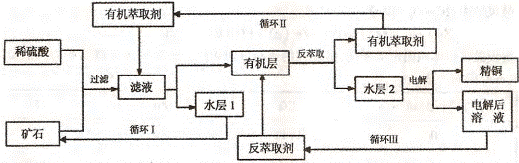 其工艺流程图如下:其中铜的萃取(铜从水层进人有机层的过程)和反萃取(铜从有机层进人水层的过程)是现代湿法炼铜的重要工艺手段。