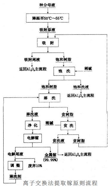 离子交换法:该方法从拜耳母液中回收金属镓,无需往铝酸钠溶液中加任何试剂,不会影响氧化铝生产工艺,且其工艺流程短,周期作业,易于实现自动化操作,成本较低,是目前从氧化铝生产中回收镓的最经济的方法,并且已经实现了工业化生产。