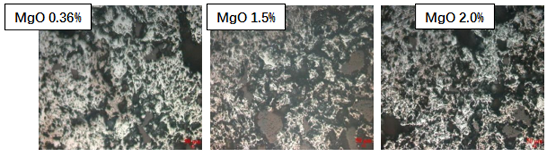 研究表明采用含镁铁精矿、富镁膨润土、镁质粘结剂、氧化镁粉、镁橄榄石等提高球团矿的MgO含量,可降低还原膨胀率、提高软熔温度,但预热球和焙烧球强度均随球团MgO含量的升高而明显降低。