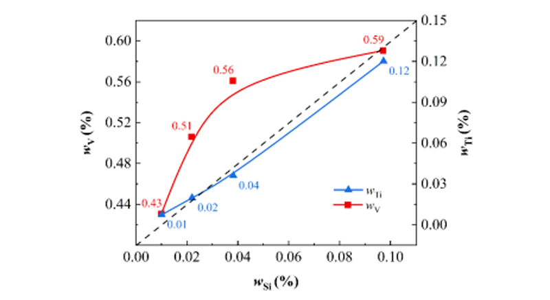 铁液中Si元素可还原TiO2,在实验条件下,增加Si有利于V进入铁液,但促进了TiC和TiN的生成,使炉渣黏度增加。