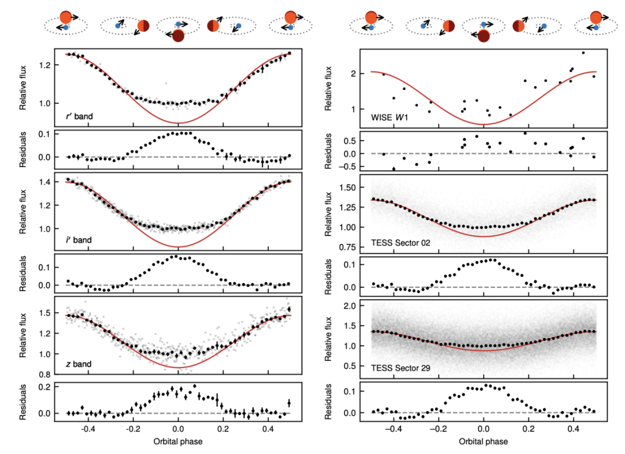 在白矮星和褐矮星绕转的过程中(上方示意图),地球上观察到的白矮星辐射流量发生周期性的变化(图片来源:参考文献[1])