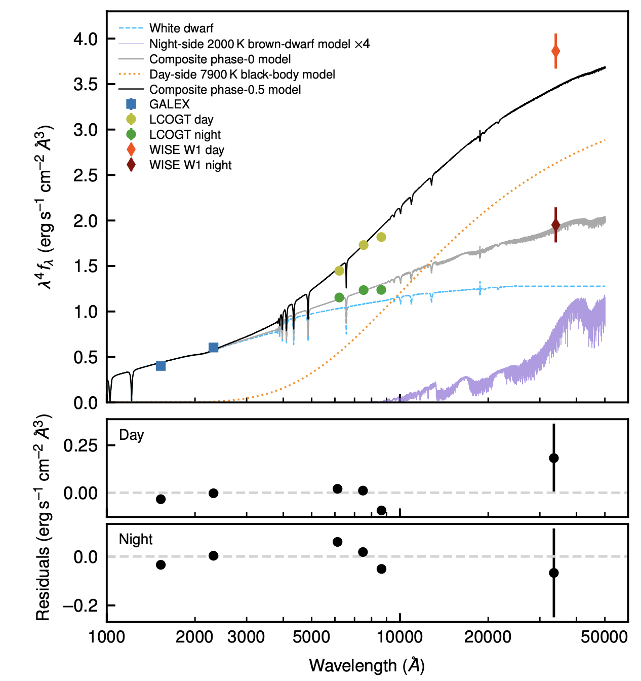 紫色与灰色曲线分别代表黑夜侧和白昼侧的能量分布,天蓝色曲线代表白矮星能量分布,黑色曲线代表总体能量分布。(图片来源:参考文献[1])