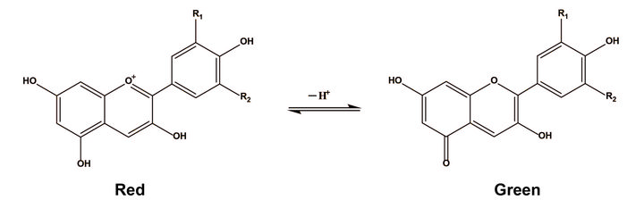 如图所示,在不同酸碱度的环境中,花青素会产生不同的颜色变化。这是因为花青素分子结构在不同pH环境中,酚式结构与醌式结构之间发生互变异构,从而引起颜色变化。这种变化在苯酚氧化过程中就会体现,而花青素分子中存在多个酚羟基,因此颜色变化也更加复杂。