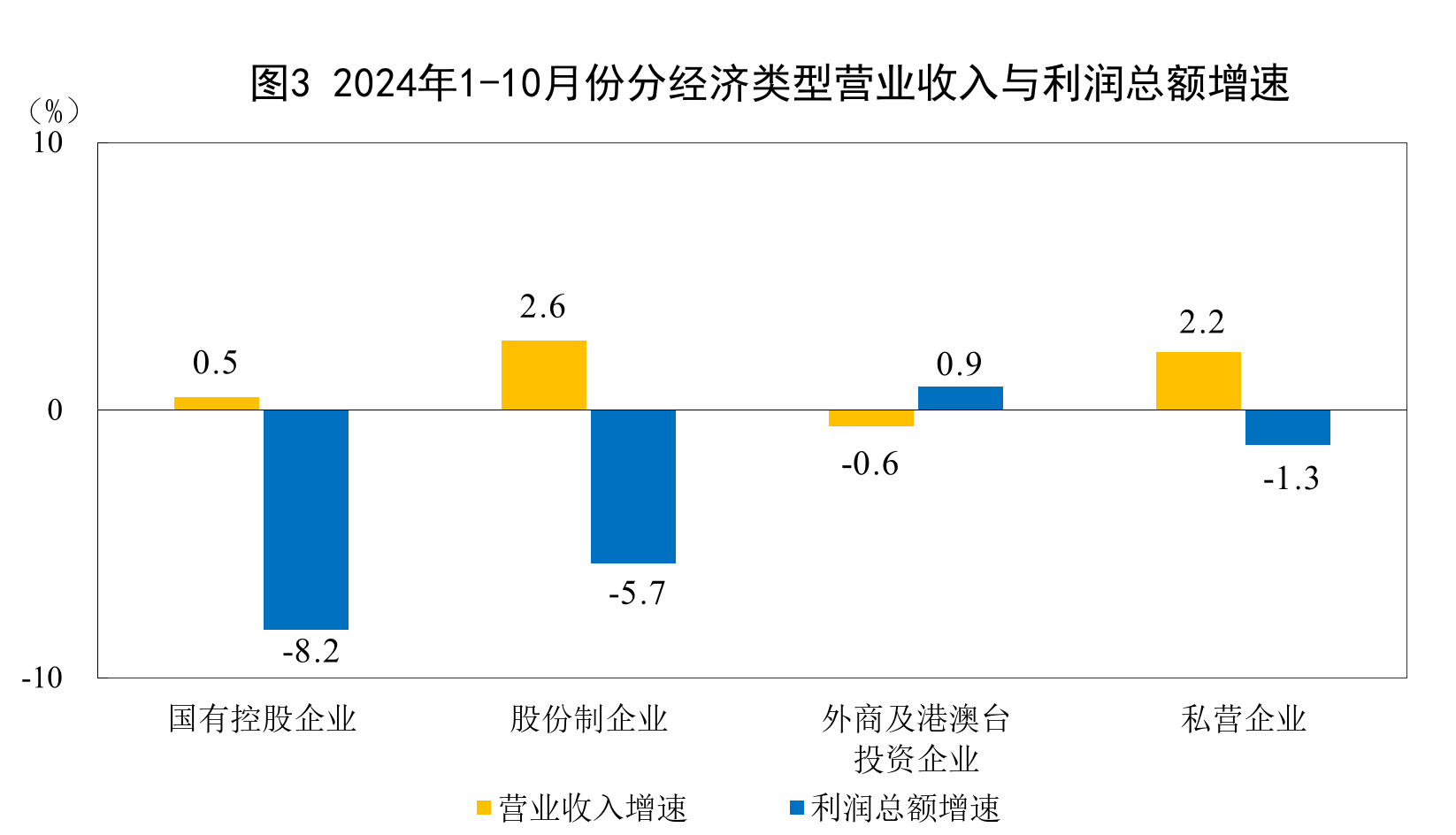1—10月份,规模以上工业企业中,国有控股企业实现利润总额18530.9亿元,同比下降8.2%;股份制企业实现利润总额43718.5亿元,下降5.7%;外商及港澳台投资企业实现利润总额14559.0亿元,增长0.9%;私营企业实现利润总额16501.7亿元,下降1.3%。