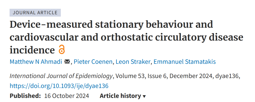[1]Ahmadi, Matthew N., et al. "Device-measured stationary behaviour and cardiovascular and orthostatic circulatory disease incidence." International Journal of Epidemiology 53.6 (2024): dyae136.
