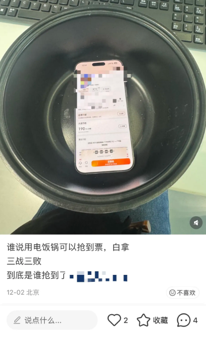 其次,与抢票相关的焦虑也会强化一种行为仪式化倾向。当用户面临高度竞争、几乎无法完全掌控结果的场景时,人们往往需要通过某种重复而可执行的动作来获得心理上的稳定感。把手机放进电饭锅、清后台、重启手机、把手机举高等,都是这一类操作。