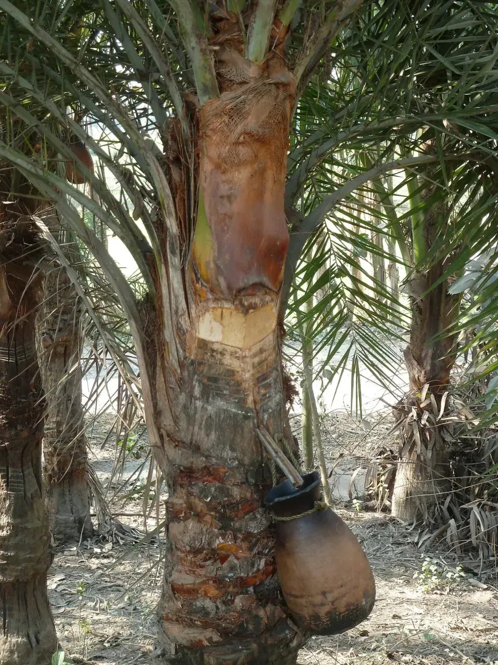 图1、印度西孟加拉邦用于采收糖汁的银海枣,注意引流条和罐子丨wiki