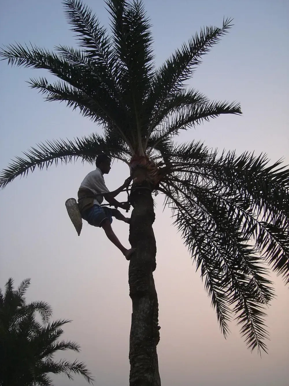在糖棕(Borassusflabellifer)的花序上收集糖汁。左边树上黑色的是装树汁的陶罐,右边树上偏红色的是糖棕的果实,其未成熟的胚乳也可以吃,在南亚和东南亚很多地方都能吃到丨wiki。