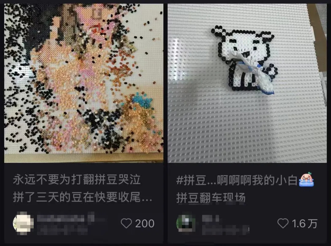 当然,艺术创作总有不完美。爱好者们晒“翻车”的帖子也很引人注目。无论是“翻”在最后一步的熨烫(烫糊了、烫拉丝了,烫成一坨了),还是“翻”在拼豆过程中(被猫踢翻→作品报废;或刚分好颜色的豆整盒摔在地下,混成五彩缤纷的一堆),都能收获一大波“既心疼又忍不住笑”的评论。