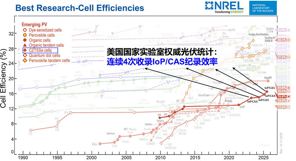 图. 美国国家实验室最新发布的最高太阳能电池效率统计图 (Best Research-Cell Efficiency Chart),连续4次收录了团队CZTSSe器件纪录效率