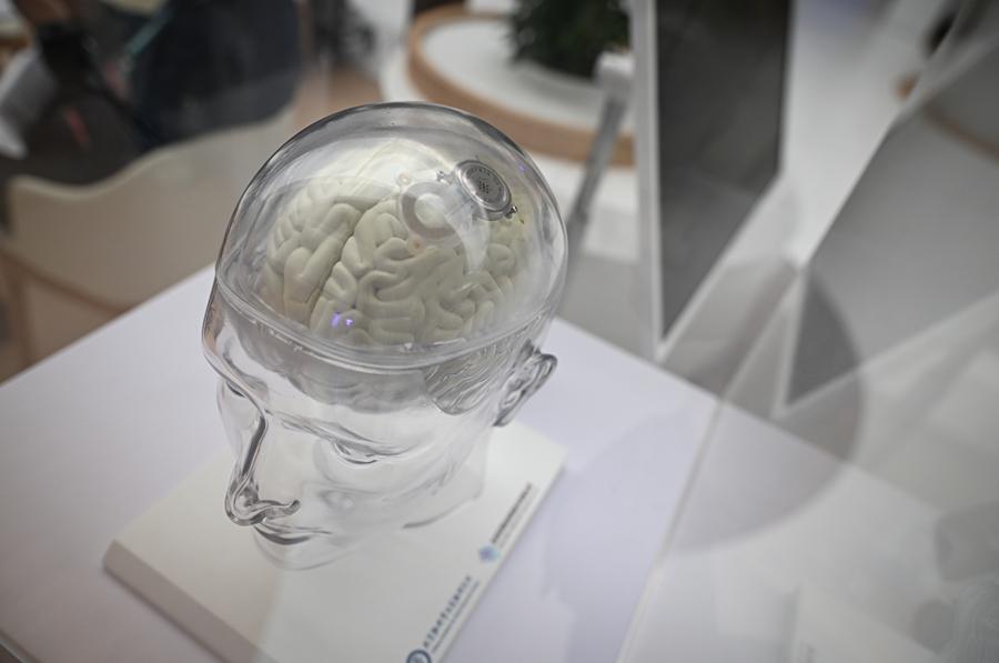在2025中关村论坛年会上展示的“北脑一号”智能脑机系统模型。图片来源:新华社(陈钟昊 摄)