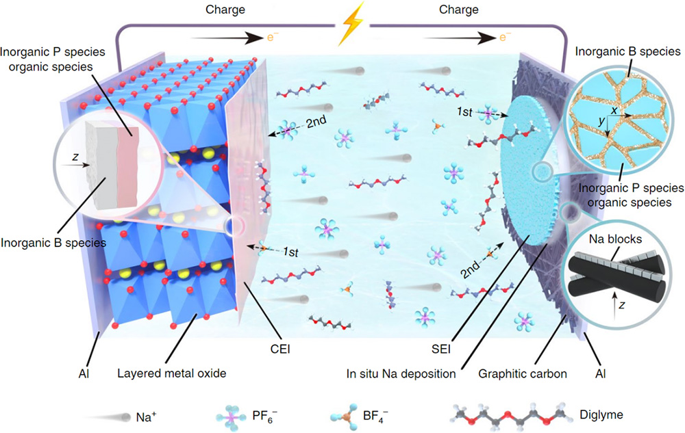 实现该类电池高比能与长循环寿命的关键在于正极、集流体与电解液侧的综合性设计。在正极侧,该研究选取了不含钴的铜基O3相层状氧化物,保证电池高能量密度的同时具有低成本和可持续性。为了实现自下而上较为平滑的金属钠沉积,在负极集流体侧选用石墨化碳涂层使钠离子具有较低的形核过电势,控制金属钠以较小尺寸均匀密集形核。然而,研究发现即使用该亲钠型集流体涂层,传统的醚类电解液中沉积的金属钠表面依然存在裂纹,裂纹会不断与电解液发生反应消耗活性金属钠,并导致后续循环中不均匀的钠沉积甚至钠枝晶形成。为了进一步解决上述界面破裂问题,该研究设计了一款含硼盐的电解液,利用多尺度的界面表征技术捕捉到其分解产物在负极(SEI)及正极(CEI)界面处均形成了非晶态固体电解质中间相,并且硼-氧组分在负极侧界面膜的外层呈现二维分布,而在正极侧界面膜的内层呈现三维分布。基于量子化学/分子动力学模拟发现添加了硼盐后的电解液具有特殊的溶剂化构型进而影响在正负极侧的分解顺序,合理地解释了这种含硼组分在正负极侧异质分布的奇异现象。坚固且柔性的SEI膜有效地抑制了死钠及钠枝晶的形成,修复了金属钠沉积和剥离过程中形成的裂纹,而超薄的CEI膜则保护了正极的结构完整性并阻碍过渡金属离子溶解。
