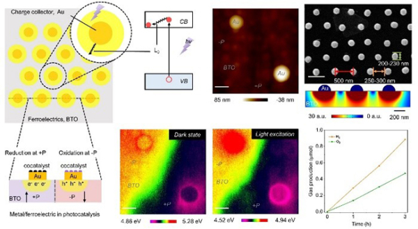 本研究提出了一种在铁电半导体的正、负畴区构筑电荷收集纳米结构的方法,通过高效收集和利用光生电子和空穴,实现了铁电光催化剂的全分解水反应。研究观察到光生电子和空穴分别在正、负极化Au/BaTiO3界面处聚集的现象,其空间电荷层宽度取决于BaTiO3光生载流子的热能化长度(~50 nm)。科研团队在铁电半导体正、负极化畴区构筑微纳金属阵列结构,进一步组装还原和氧化助催化剂后发现,Au/BaTiO3铁电光催化剂可实现光催化全分解水反应,即使在单晶材料上仍能表现出可观的催化活性。该成果为高效利用铁电材料中高能光生电荷、实现高效太阳能转换提供了新的思路和方法。