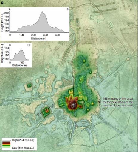 图中显示的这些建筑是由卡萨拉贝社区于公元500-1400年间建造的,是以前的房屋、梯田、围墙等人造事物的痕迹。这张图片是直升机搭载激光雷达在森林上空进行勘探并经过后期图像处理得到的。