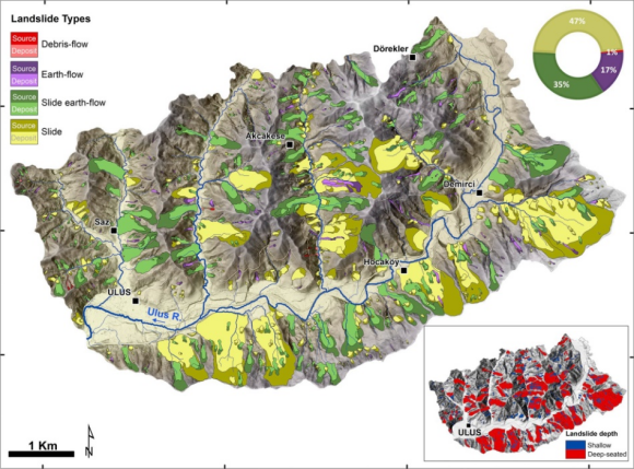 基于激光雷达测绘得到的滑坡清单地图,不同颜色的区域代表不同类型的山体滑坡右下角小地图中的红色色块代表深层滑坡,蓝色色块代表浅层滑坡。