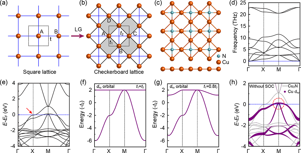 图一:棋盘晶格的构筑和单层氮化铜的电子结构