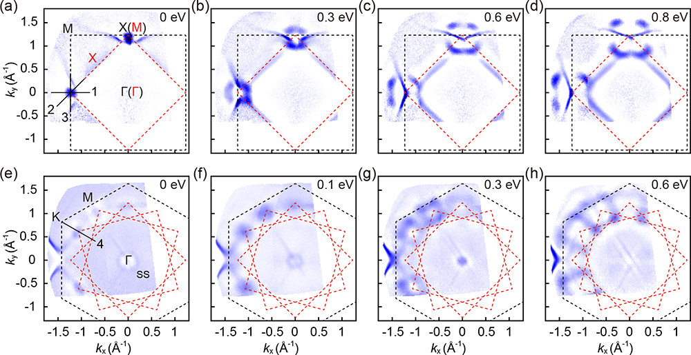 棋盘晶格特殊的对称性要求使他们联想到c(2×2)表面重构体系。如果在正方晶格的基础上增加周期性的原子,形成c(2×2)超结构,便可以实现棋盘晶格要求的跃迁方式。按照这一思路,他们找到了一种新型的二维材料——单层Cu2N。声子谱计算和分子动力学模拟证实了单层Cu2N在自由状态下是稳定的。第一性原理计算表明,单层Cu2N在费米面附近不仅存在Cu原子构筑的棋盘晶格所特有的空穴型能带和拓扑平带,还存在N原子轨道贡献的范霍夫奇点。利用分子束外延技术,他们在Cu(100)和Cu(111)两种不同的衬底上均生长出了单层Cu2N。利用角分辨光电子能谱技术,他们发现单层Cu2N在布里渊区的M点存在一个空穴型的能带。第一性原理计算和紧束缚模型分析表明,该空穴型能带正是起源于由Cu原子构成的棋盘晶格。