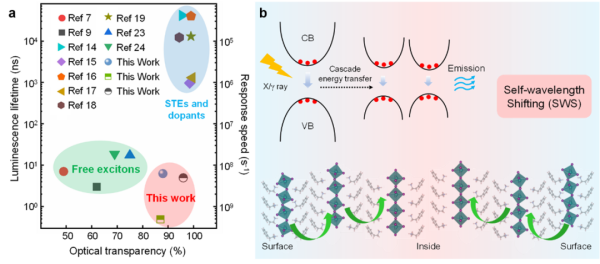 近年来,X/γ射线的探测在医学成像、剂量测量、辐射防护等领域应用广泛。铅卤钙钛矿作为新兴的闪烁材料而备受关注。然而,铅卤钙钛矿激子发光的斯托克斯位移较小,存在自吸收问题,大量激发光子无法被探测到,制约了该材料的探测性能和应用。
