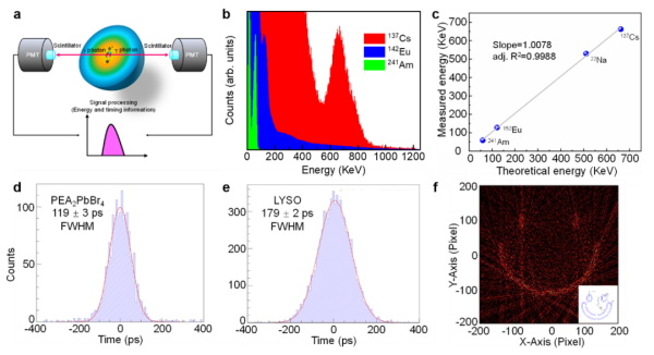 图3. 二维钙钛矿的γ射线性能测试与正电子发射计算机断层扫描仿体成像结果