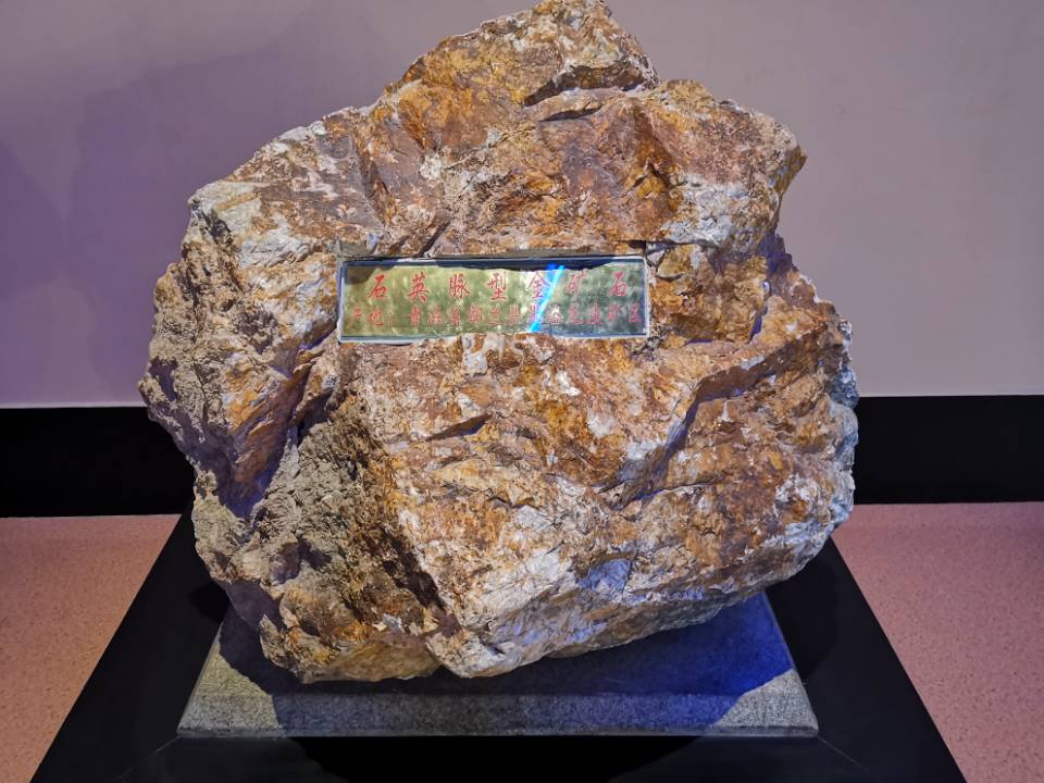 而在另一侧的展柜内有一块貌不惊人的巨石——石英脉型金矿石标本。据讲解员介绍,它来自海西蒙古族藏族自治州都兰县果洛龙洼矿区,这是一块与石英伴生的高品质岩金矿石。金矿资源在青海省广泛分布,有砂金、岩金两大类型。砂金分布遍及青海省各水系流域,开采历史悠久,有产地77处。岩金在青海省各主要金属矿成带岩有不同程度的发现,探明岩金储量主要为伴生金。