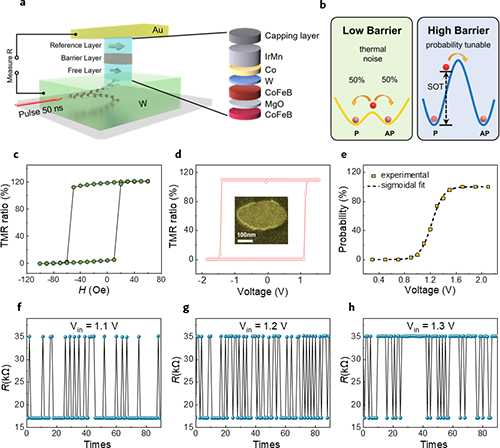 图1. SOT-MTJ的随机翻转性能。(a) SOT-MTJ的堆叠结构。(b) 低势垒和高势垒MTJ的能量分布示意图。(c) R-H测试,沿着MTJ的易磁化轴扫描平面内磁场。(d) 由50ns脉冲电流驱动的零场翻转。插图是MTJ的扫描电子显微镜(SEM)图像的顶视图。(e) 作为Vin的函数的切换概率(P)及其与匹配良好的S形曲线的拟合结果。(f)-(h) 在1.1 V (f)、1.2 V (g)和1.3 V (h)的特定电压下连续测试获得的磁矩翻转导致磁电阻高(1)低(0)变化的实验结果。