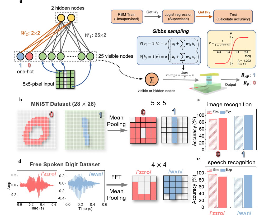 图2. 基于SOT- MTJ实现的受限玻尔兹曼机(RBM)原理图以及图像和语音识别。(a),以典型的RBM结构为例,25 个可见节点(vi)和2个 隐藏节点(hj)。训练过程分为三个部分,RBM训练(无监督)、逻辑回归(有监督)和最终测试(计算准确率)。每个节点的吉布斯采样可以都通过SOT-MTJ来实现。具体而言,根据S形函数sigmoid函数的概率采样P(vi=1|h)和P(hj=1|v)可以直接用SOT-MTJ的简单磁矩翻转调控来代替。可见(隐藏)节点的条件概率P取决于来自其连接的隐藏(可见)节点的总体加权求和。这里的参数A和B用于重整化。(b) 手写数字数据集(MNIST)的“0”和“1”示例以及平均池化后的最终训练数据。(d),自由发音数字集(Free-Spoken-Digit-Datasets)的“0”和“1”示例以及快速傅立叶变换(FFT)和平均池化后的最终训练数据。(c) &(e),图像识别(c)和语音识别(e)的实验和模拟识别准确率。