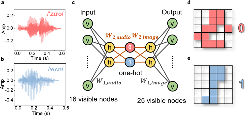 图3. 在合并的RBM上进行图像和语音跨模态学习的实验结果。(a)和(b)展示自由发音数字集中0(a)和1(b)音频。(c) 两个RBM通过一个独热编码(one-hot)层连接。左边的输入层包含音频信息,最右边的输出层包含图像信息,反之亦然。(d)和(e)则分别用(a)和(b)中的语音数据使用(c)中的网络来生成0(d)和1(e)的图像。
