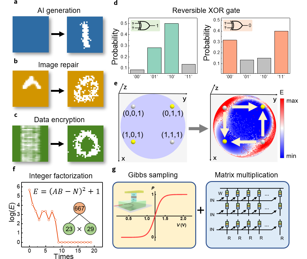 图4。基于SOT-MTJ的RBM展望。(a-c),RBM在生成(a)、图像修复(b)和数据加密(c)中的模拟结果。(d),可逆XOR门的实验结果,从给定的[C]中推断出可能的[AB]组合。(e) 由网络权重定义的能量(E)是可逆XOR门的输入(x,y)和输出(z)的空间坐标的函数。左图是具有所有零初始化权重的相位空间;右边是训练后的相空间。黄点对应于1的输出的正确XOR状态,而银点表示XOR门应避免的错误状态。正确状态的选择是通过正确塑造这里的能量空间来实现的。(f) 在实验中使用基于SOT-MTJs的RBM的整数分解过程。(g) 基于SOT-MTJ的吉布斯采样可以与同样基于MTJ阵列的矩阵乘法相结合,以构建全自旋电子硬件RBM加速器。