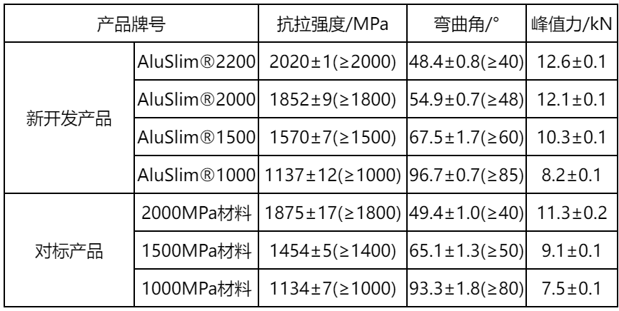 开发了超高强度高韧性热冲压钢AluSlim®2000和AluSlim®2200,AluSlim®2000淬火态抗拉强度≥2000MPa,回火后≥1850MPa,三点弯曲角≥50°;AluSlim®2200淬火态抗拉强度≥2100MPa,回火后≥2000MPa,三点弯曲角≥45°。相较于原工业产品,其综合强韧性提高10%~20%,其中AluSlim®2200为全球最高强度铝硅镀层热冲压钢,同时打破了国外钢铁巨头在2000MPa级铝硅镀层热冲压钢的全球独家供货格局。