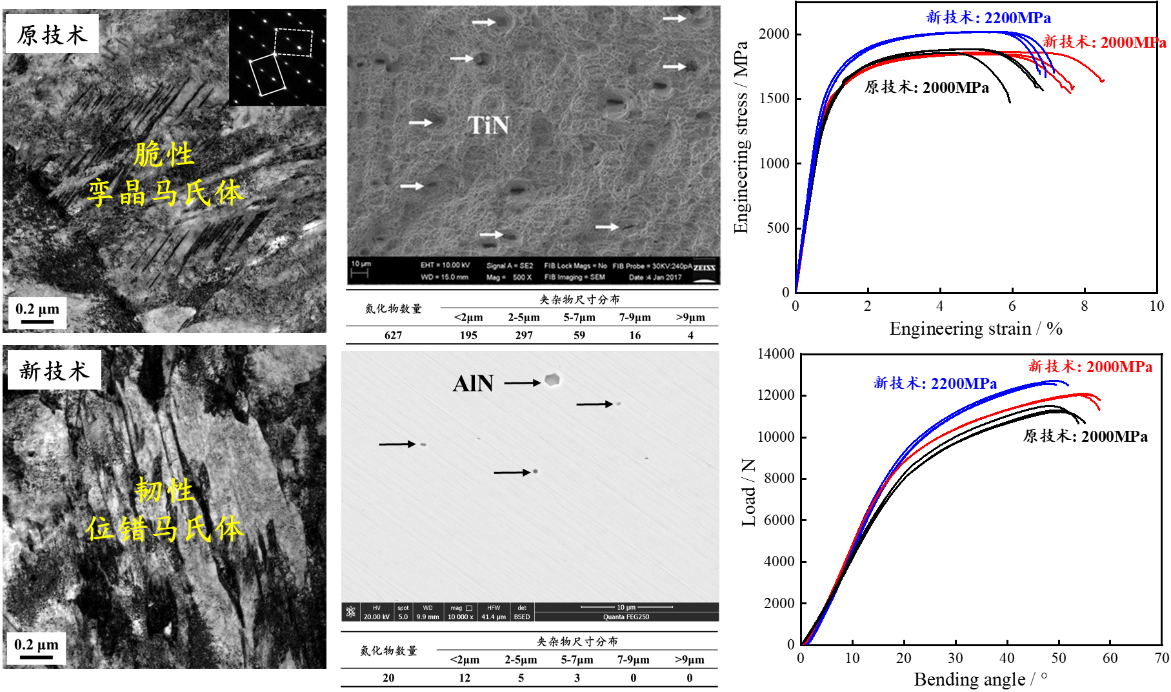 2000MPa级高强度铝硅镀层热冲压钢(抗拉强度淬火态~2000MPa,回火态~1800MPa)用于车身防侵入件,但原技术韧性缺陷使其碰撞安全性不足,只少量应用于加强件中。基于前期纳米析出韧化2000MPa级热冲压钢技术,团队通过添加0.3%~0.6%的Al元素,提高马氏体相变结束温度,抑制孪晶马氏体生成,得到位错马氏体为主的组织,同时,Al还可与N结合生成固析AlN夹杂物,其尺寸远小于TiN,避免大尺寸夹杂物的生成恶化韧性。