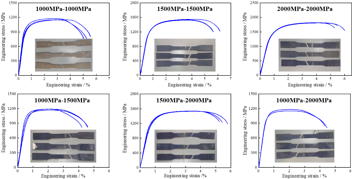 图5新型1000-1500-2000MPa铝硅镀层热冲压钢直接激光拼焊后拉伸曲线和宏观断裂行为