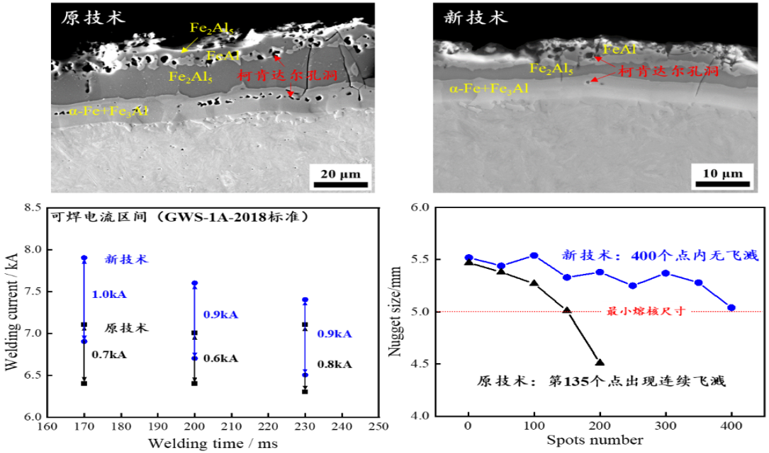 本团队提出了柯肯达尔孔洞遗传效应,发现柯肯达尔孔洞的形成均为热浸镀过程中生成了几十纳米级的初生柯肯达尔孔洞,在热冲压加热过程中不会新生产柯肯达尔孔洞,只是孔洞的长大。因此解决柯肯达尔孔洞问题的关键在于热浸镀工艺,通过调整涂镀时铝硅熔液温度及带钢与铝液温度差,降低液态铝与铁基体的合金化速度抑制初始柯肯达尔孔洞生成,使薄镀层产品满足了汽车行业焊接标准。