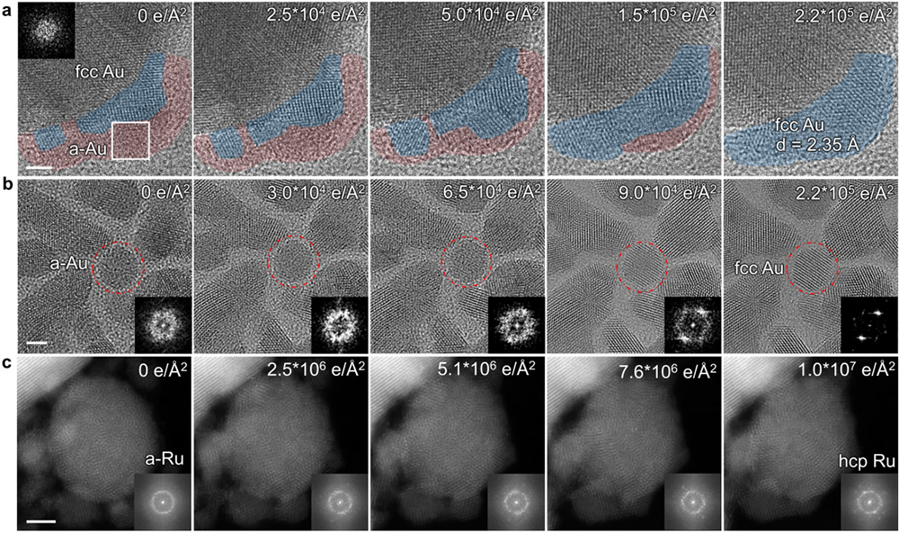 图2电镜下原位电子辐照单质非晶金和钌的无序-有序转变