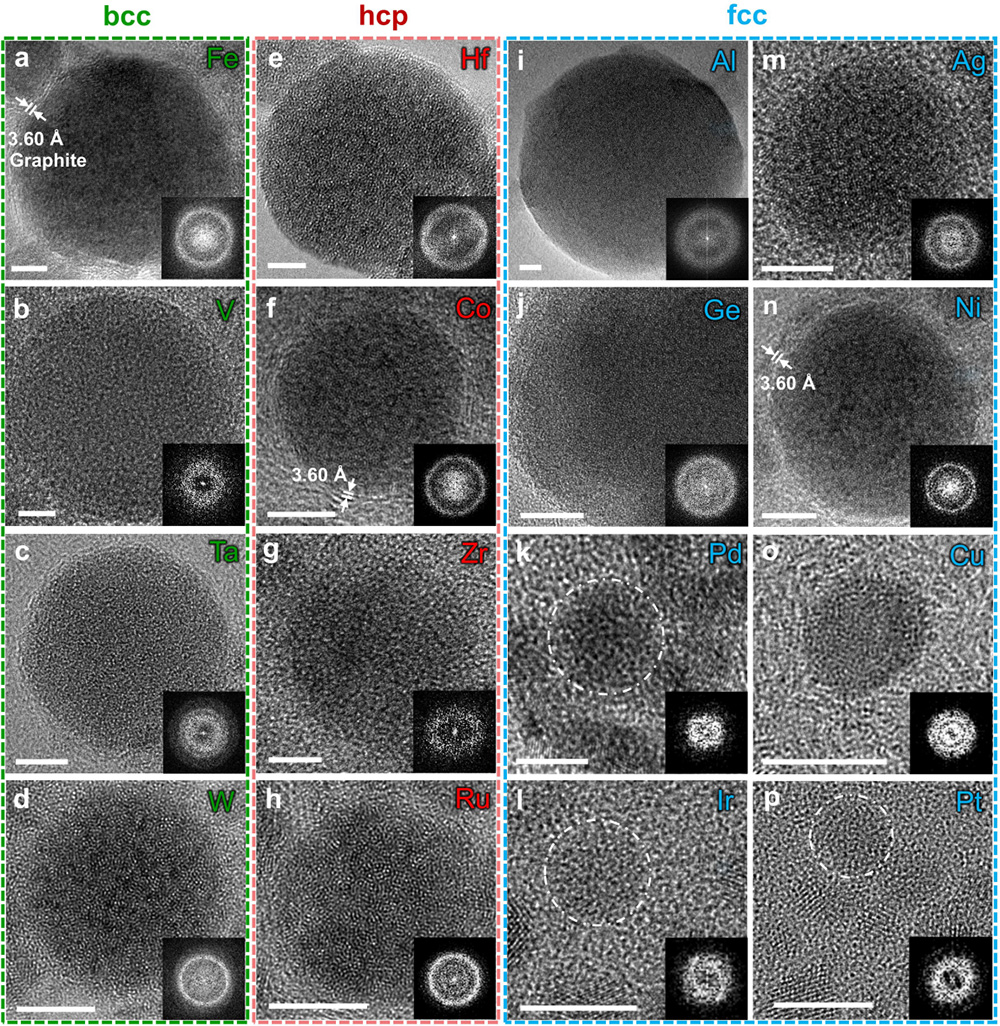 为了验证所制备的纳米颗粒为非晶态单质金属,团队采用了双球差矫正透射电子显微镜(Cs-corrected TEM)、电子能量损失谱(EELS)、X射线光电子能谱(XPS)等先进表征技术,对多种晶体类型的单质金属的非晶样品进行了原子结构、成分和电子价态等的详细分析,证实了样品的非晶单质特性(见图1)。此外,通过原位电子辐照实验,观察到单质非晶结构向晶体结构的转变过程,且无序-有序转变后的晶格常数与该金属的晶体晶格常数相匹配。同时发现不同单质非晶之间、同一单质非晶的不同样品之间在电子辐照下的稳定性存在差异,这表明非晶态单质金属的稳定性与其构型密切相关(见图2),也证实了这种构型高通量的方法可以有助于我们筛选到不同构型和不同稳定性的单质非晶。 该技术实现了所有结构类型(面心立方、密排六方和体心立方)单质金属的非晶化,进一步验证了该方法的普适性(见图3)。