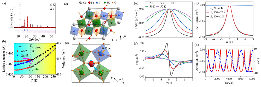 图:CaFe3Ti4O12的晶体结构和磁电耦合效应。(a) CaFe3Ti4O12的室温下的晶体结构。(b) 随温度变化的晶格常数和晶胞体积。(c) 低温下极化的晶体结构。(d) 结构相变时发生的离子位移。随磁场变化的(e)电极化强度变化ΔP(H) = P(H) - P(0 T)和(f)磁电耦合系数α = dP / dH。 (g)不同极化方式测量的ΔP(H)。(h)周期性磁场下的ΔP(H)。