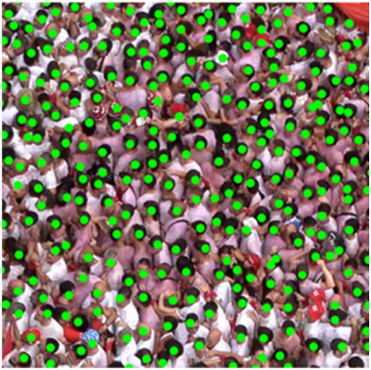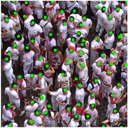开幕前57 分 15 秒的人群特写。绿色圆点显示了节日参与者头部的位置。