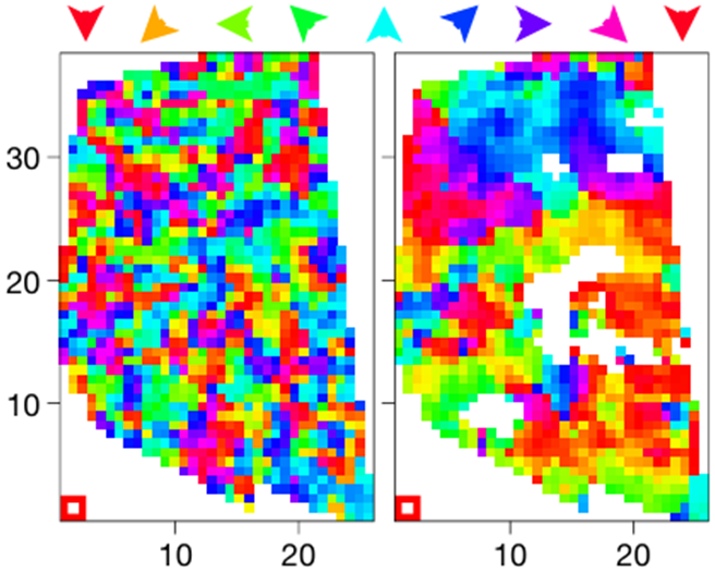 开幕前57 分 15 秒(左)和开幕前 30 秒(右)的两个人群中自发流动局部方向图。很明显当人群密度提高时,自发地形成了宏观尺度的同向运动