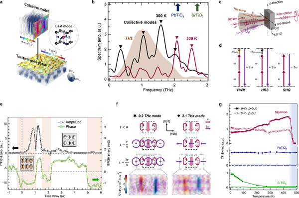 研究通过动力学相场模拟发现,PbTiO3/SrTiO3超晶格中的极性斯格明子具有一系列低于2THz的集体动力学模式,其频谱与基于铌酸锂产生的太赫兹脉冲高度匹配。研究依托太赫兹光谱单元发展的太赫兹场致二次谐波技术,利用强场单周期太赫兹脉冲实现了与上述集体模式的共振耦合,从而相干地驱动体系进入一个瞬态的、具有宏观极化的隐藏极性相,并在4K至470K的超宽温度范围内实现稳定调控。研究进一步通过干涉式太赫兹场致二次谐波技术,捕捉到瞬态极化的多重翻转,并识别出0.2THz与2.1THz两个特征激发模式。