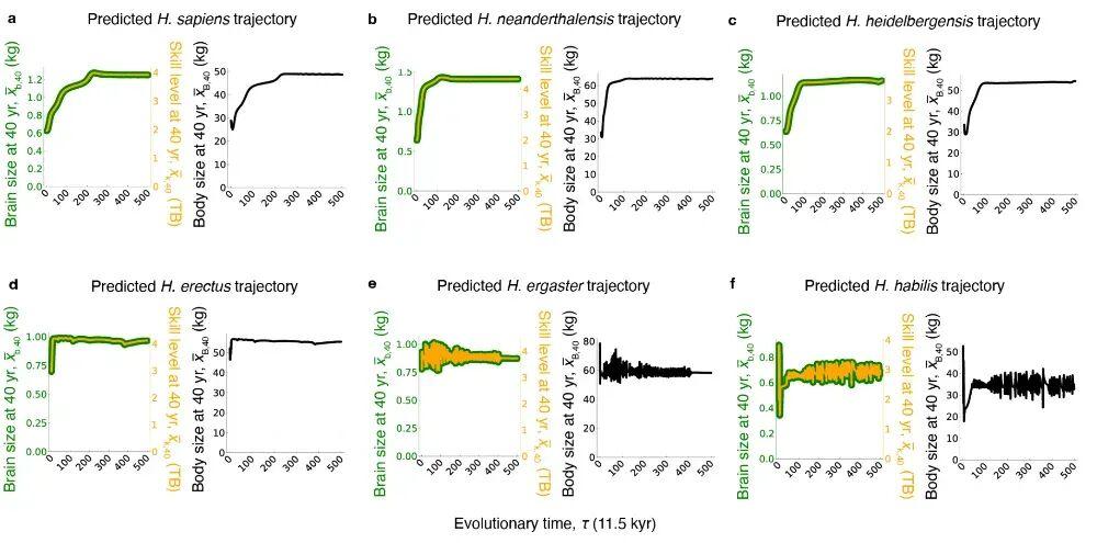 人类脑容量、体重与技能水平在数百万年进化过程中的变化趋势。脑容量在进化历史中先快速增长,随后略有回落;体重与脑容量同步上升;技能水平则随脑容量逐渐累积,呈现出远比脑体更平滑的增长轨迹。