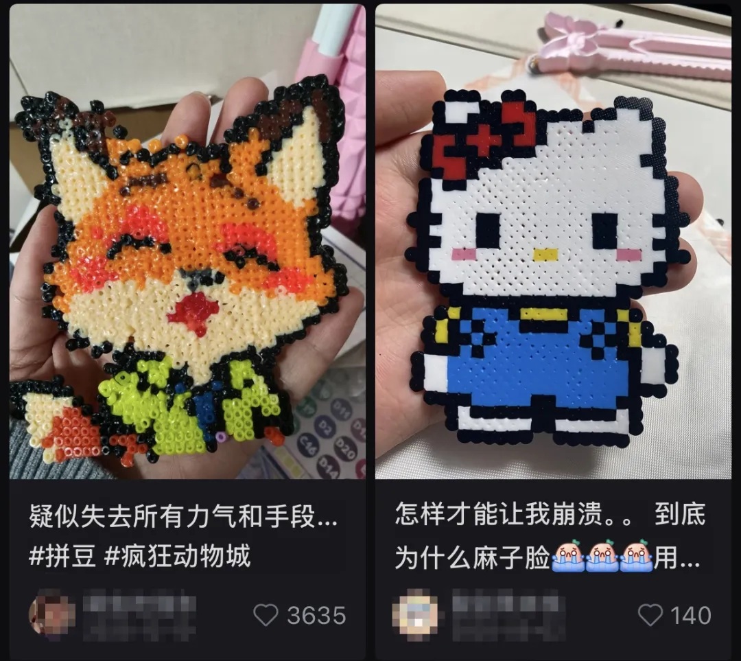 完成一个拼豆作品后,分享到社交媒体上就能收获很多点赞——这种对于“社交认同”的渴望,也成了不少人沉迷拼豆的乐趣之一。