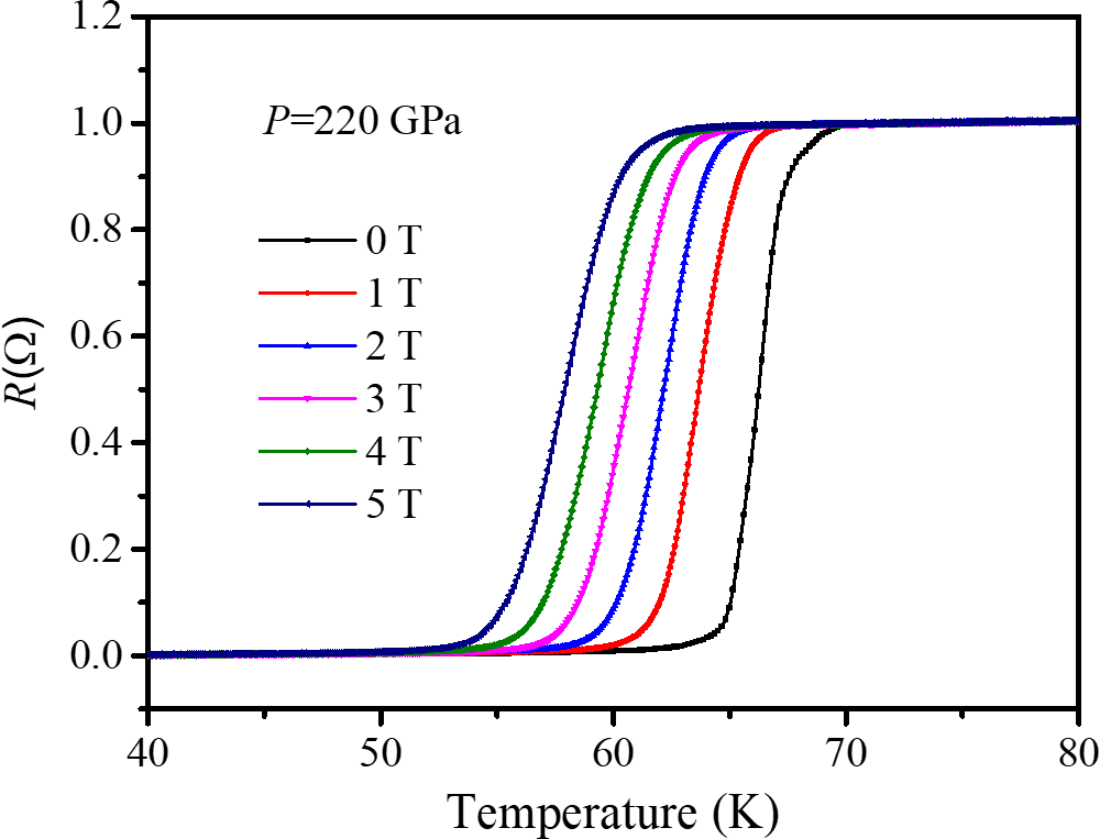 近年来高压富氢化合物的理论预测和实验发现及印证引发了对新型富氢化合物和超导研究的瞩目,目前实验发现的富氢化合物超导集中在碱土、稀土和部分共价型主族元素(C、P、S以及Sn等)氢化物,含有d电子的过渡族金属氢化物尚未见高温超导实验报导。近期,靳常青研究员指导博士生张昌玲与何鑫等人,在IVB过渡族元素氢化物的高温超导新材料研究上取得重要进展。他们运用先进的高压低温强场和在位激光加热一体化的综合极端条件实验技术,在220 GPa、2000 K高压高温成功制备了锆基超氢化合物,样品在220 GPa呈现Tc~71 K的超导转变(图1)。在发生转变的区域,根据电阻对温度的微分,可以得到起始、中点和零电阻温度(图2)。通过外加磁场作用,转变向低温区移动,这和超导现象一致 (图3)。根据Tc随磁场的演化,估算上临界场约为36 Tesla,对应金兹堡-朗道相干长度约30Å。这是首次在过渡金属氢化物中实现70 K以上的超导转变,进一步拓展了富氢高温超导材料的范畴,为机理研究提供了新素材。